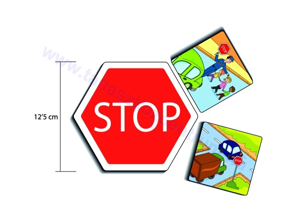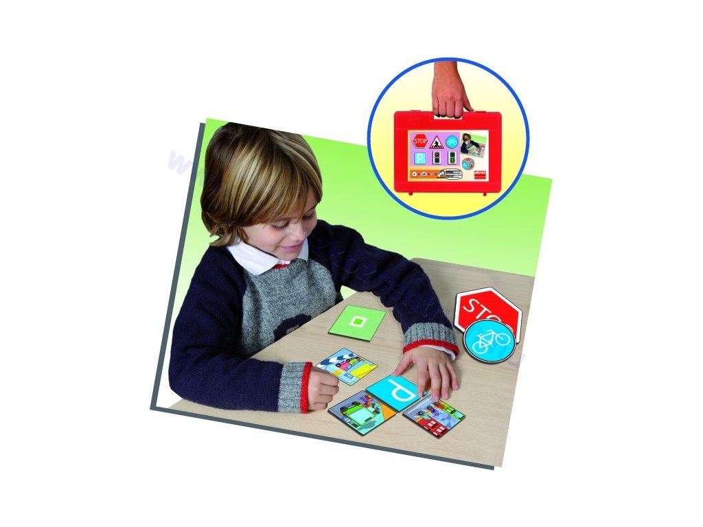 6 különböző jelzőtáblát + 21 db kártyát közlekedéshez kapcsolódó illusztrációval + dobókocka jelzőtáblák képeivel + CD-t, ami tartalmazza: a játék és a kártyák nyomtatását színezéshez, illetve multimédia bemutatóját.