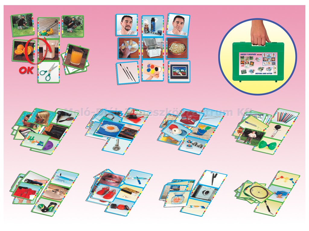 90 db fényképből álló játék, melyek 30 előtte - által - utána sorozatra vannak felosztva. Minden sorozatot 3 fénykép alkot. A játékot 10 központi, hosszúkás képkártya szervezi meg. Mindegyken 3 sorozat központi képe látható, ezeket kell a gyerekeknek kiegészíteni mindkét oldalon. Ötszínű, sávos önjavító rendszerrel rendelkezik.