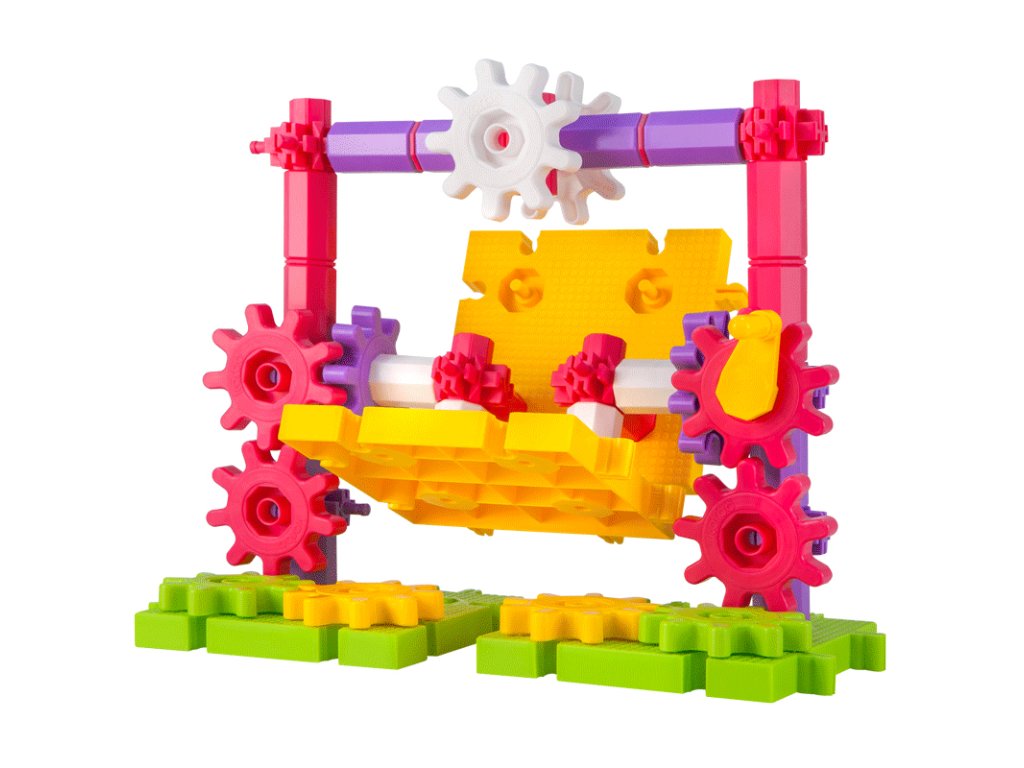 Végre egy készlet, amivel a lányok is kis építészekként bizonyíthatnak. A válogatott pasztell színek egy varázslatos játszótérre csábítanak, ahol minden forog vagy himbálózik. A szerkezetek teljesen működőképesek, egyszerre 3 különböző hinta építhető. A készlet 4 db fehér gumiabroncsot is tartalmaz, egy saját mozgó babakocsi építéséhez, a lányok kedvelt babáinak.