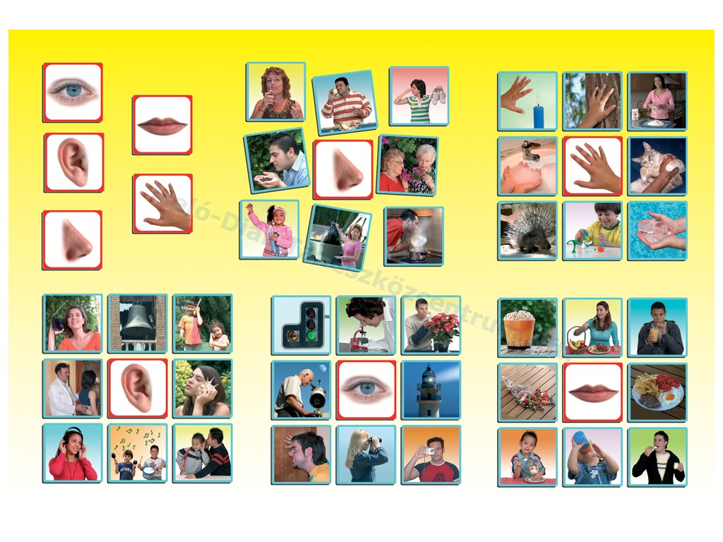 Az érzékeket bemutató játék 50 db fényképből áll, melyek az alábbiakat tartalmazzák: az öt érzékszerv fényképével ellátott 10 db alapkártya (mindegyikből kettő), valamint az öt érzékszervvel kapcsolatos és a valós életben előforduló élethelyzeteket bemutató 40 db kártya. Minden egyes érzékszervhez 8 db fénykép tartozik, melyeket a gyerekeknek az alapkártyák segítségéval kell beazonosítani és csoportosítani.