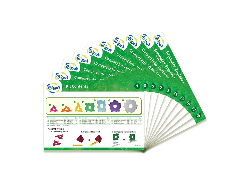Továbbá 10 darab kétoldalas feladatkártya is segíti a 3D alakzatok összeállítását.