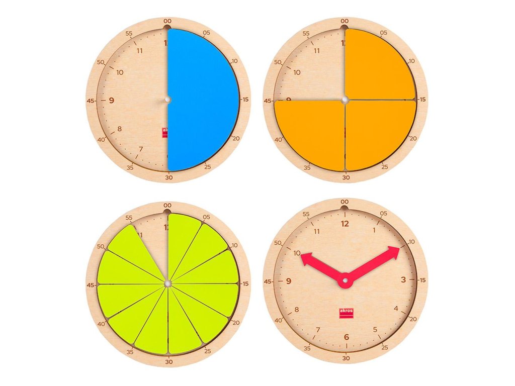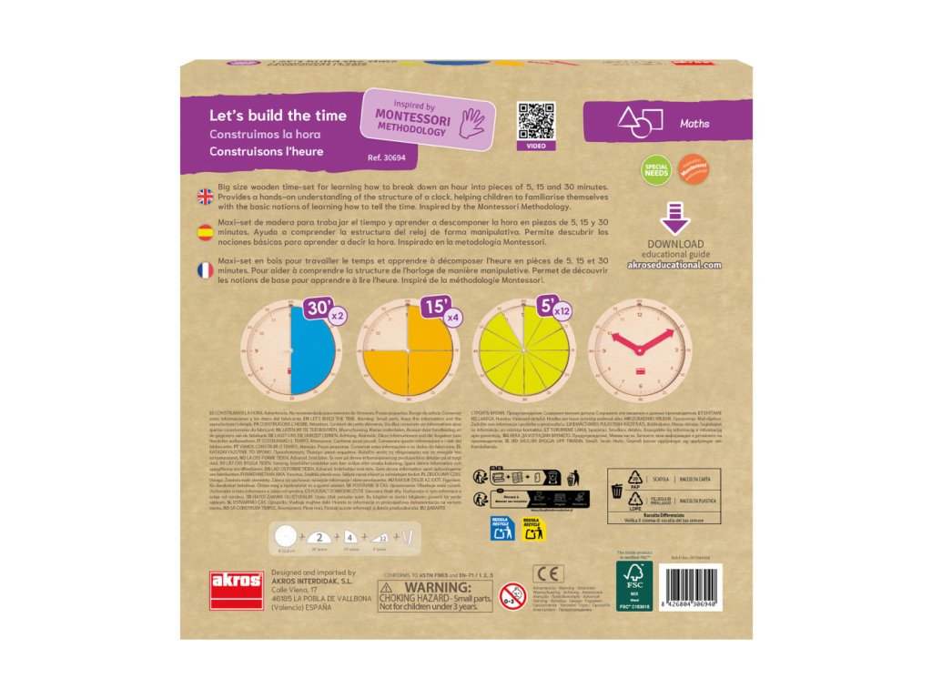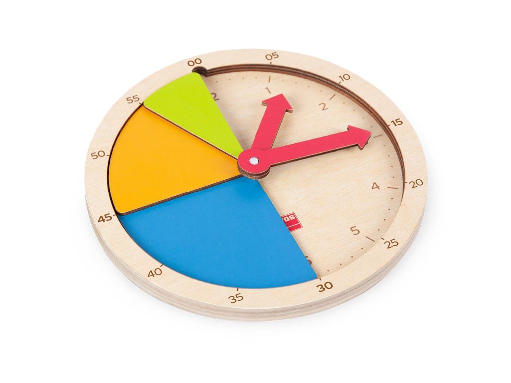 Nagyméretű fából készült időkirakó, amellyel a gyerekek megtanulhatják, hogyan bontsák le az órát 5, 15, és 30 perces intervallumokra.