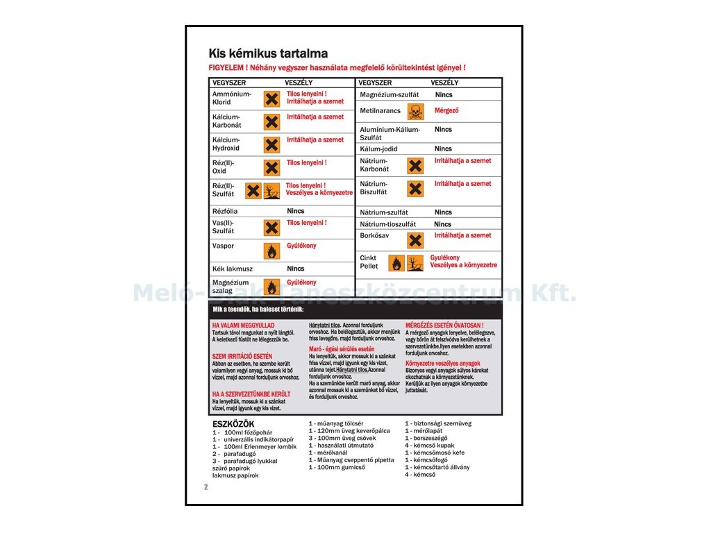 A készlet minden kísérleti eszközt és vegyszert tartalmaz, mellyel biztonságosan elvégezhető a tanulmányokban előforduló összes kísérlet.