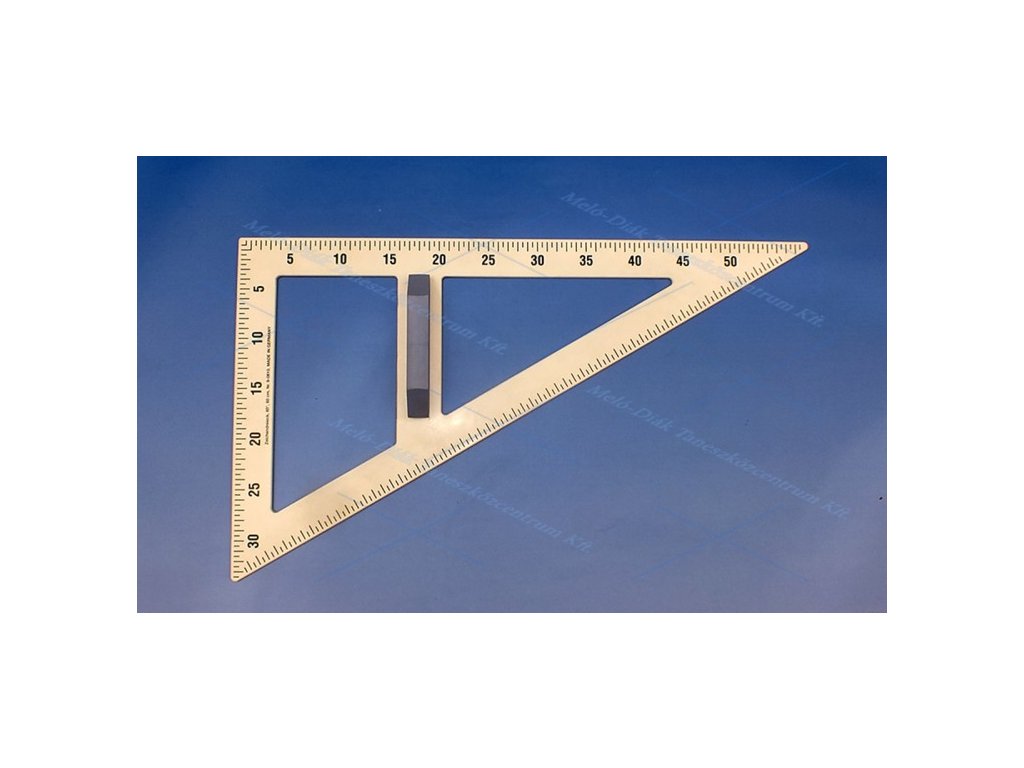 Fehér színű, műanyag, derékszögű vonalzó, minden oldalán beosztással.