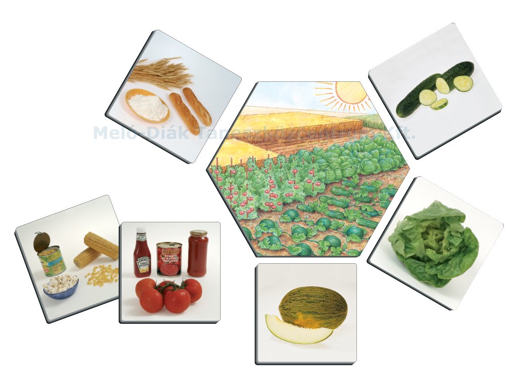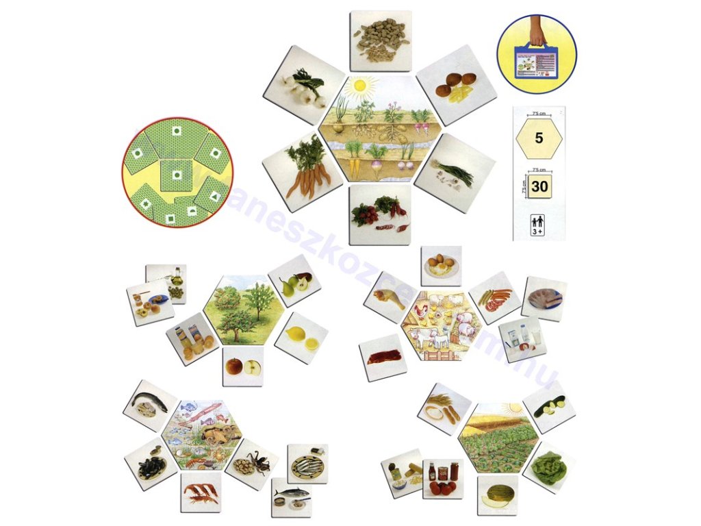 A hatszög alakú főkártyákon megtalálhatjuk legfontosabb élelmiszereink előállításának helyét.
