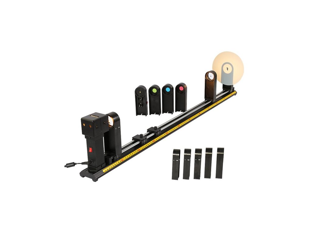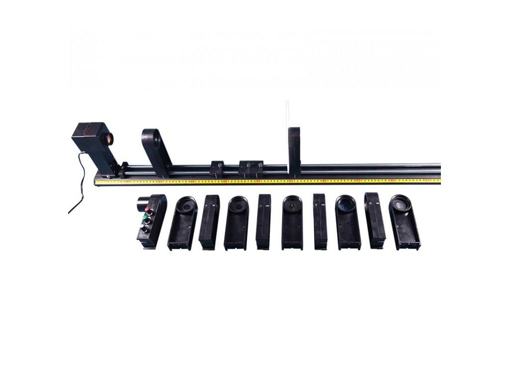 Az optikai pad 120 cm hosszú, robusztus kialakítású, felületén egy pár párhuzamos, precízen szerelt acélsínnel.
