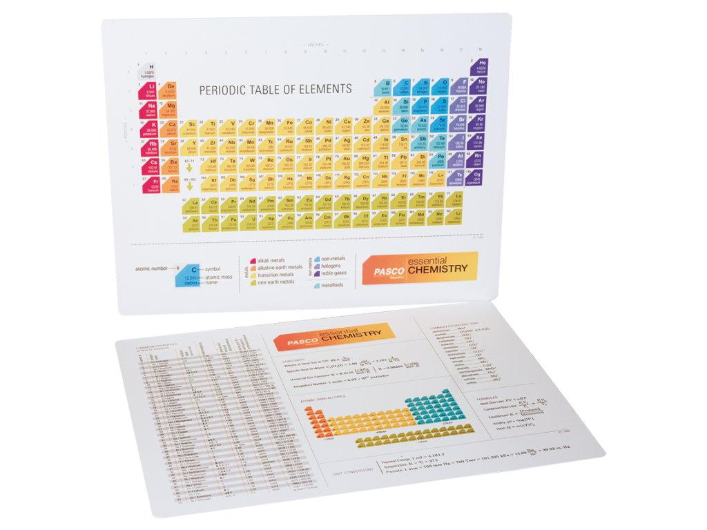 • A lap hátulján láthatóak az elemek fontosabb tulajdonságai, mértékegységváltó táblázatok, fontosabb egyenletek, állandók, az előforduló atomi pályákat és néhány többatomos szerkezetet bemutató piktogramok.
