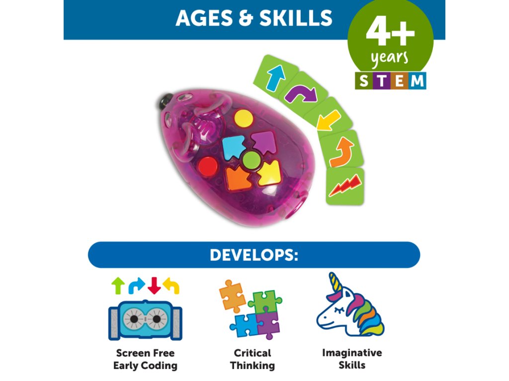 A Code & Go robotegér ideális eszköz arra, hogy a gyerekek már óvodáskortól játékosan sajátítsák el a programozás alapjait. A tanulás során fejlődik a logikus gondolkodás, a problémamegoldás, a sorrendiség felismerése, valamint a kreativitás is.
