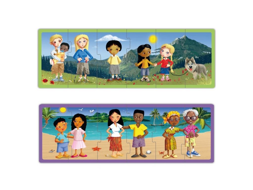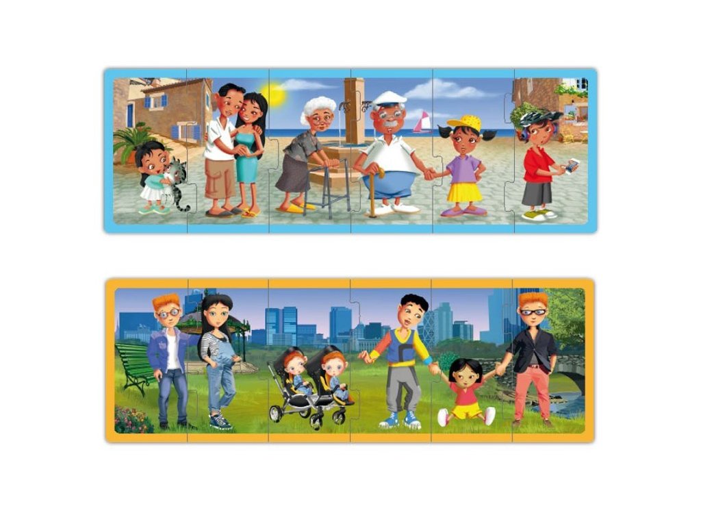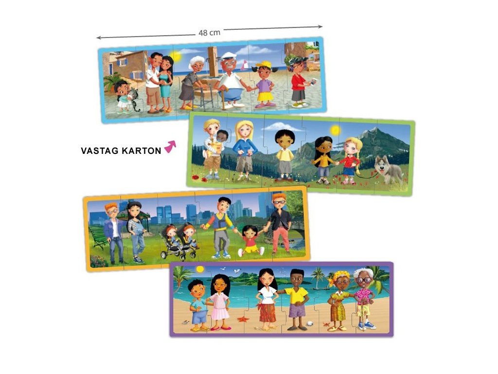 A készlet 4 db nagyméretű (48 cm széles) puzzlet tartalmaz, bemutatva a többgenerációs családok típusait a mai modern világban.