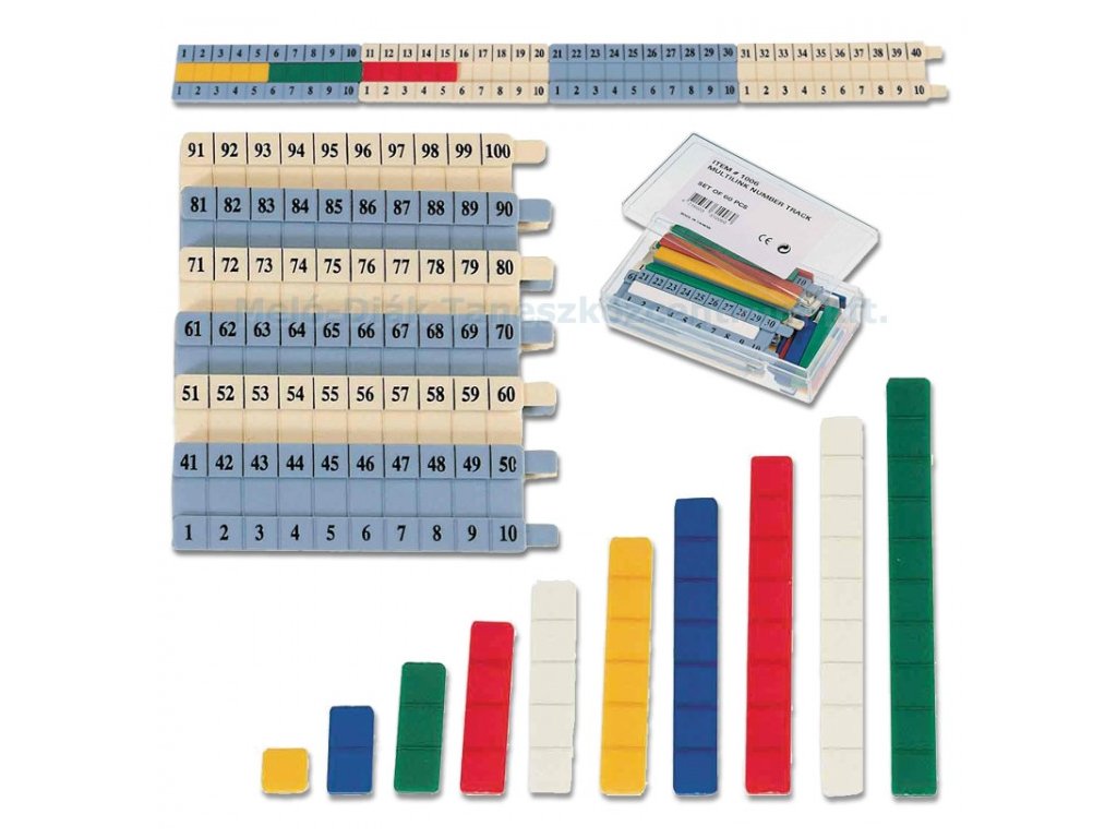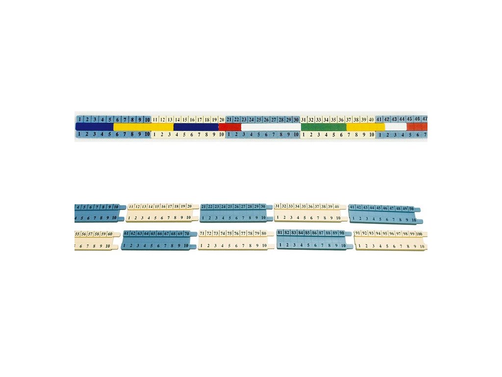 - 10 db 10 cm-es egymáshoz kapcsolható számolóléc (1–100-ig számozva, két színben),