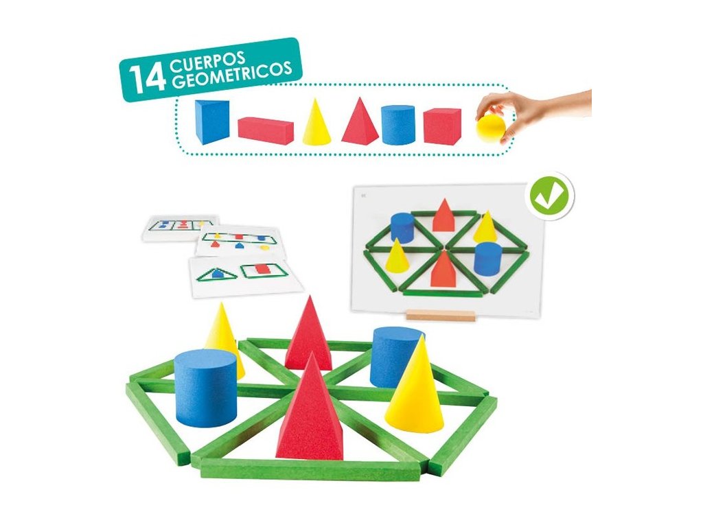 A játék 14 mértani testből (két 7 db-os készlet), 50 mintaképből és 15 hosszú rudacskából áll.