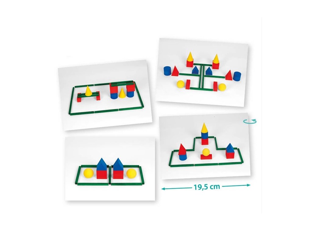 A mintaképek alapján a gyermekek megfigyelhetik minden egyes mértani test többihez viszonyított helyzetét, majd felépítheti a fényképen lévő elhelyezést. Ezáltal kapcsolatot teremthet a háromdimenziós tér és annak két dimenzióban való lapos ábrázolása között.